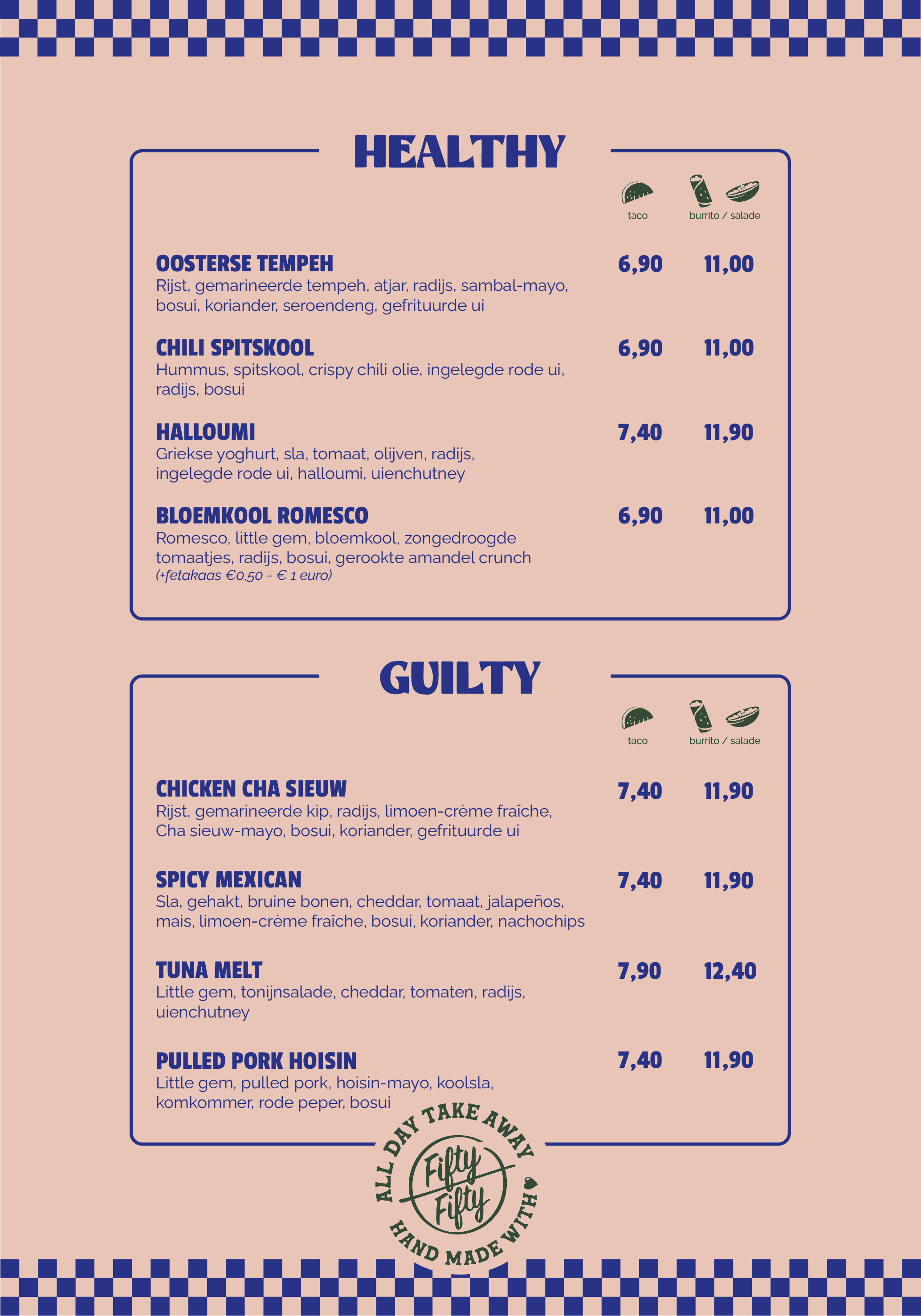 Brakke zondag? Lunch voor jou en je collega’s? Te weinig tijd / zin / inspiratie* om te koken? We got you covered! Fifty/Fifty speelt in op die twijfel: "vandaag healthy of guilty?" Van ieder take-out gerecht hebben we een healthy variant, of een guilty variant. Aan jou en je ruggengraat de keuze welke gerecht het vandaag wordt. Benieuwd naar wat we verkopen?
